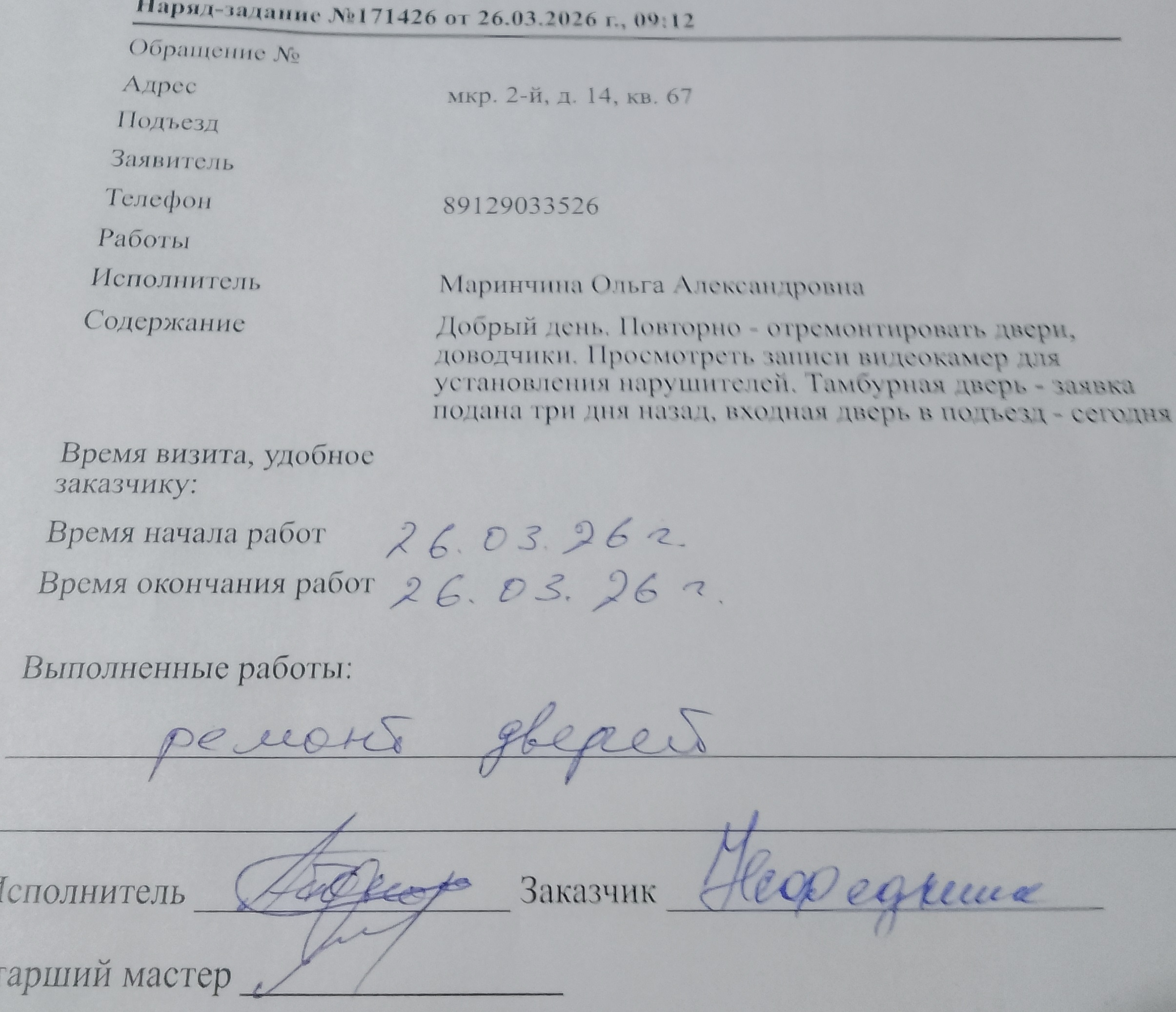 Доброго дня! На Ваше обращение сообщаем, что ремонт дверей произведен. Просмотр видео не производился в связи с незначительной стоимостью восстановительных работ. С уважением, ООО УК "Центр"